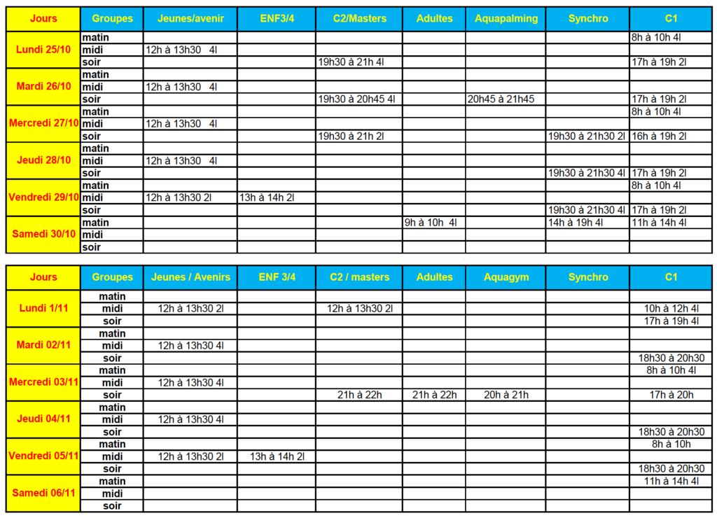 Groupes Jeunes Avenirs - ENF3/4 - C2/Masters - Adultes - Aquapalming - Aquagym - C1 - Synchro.